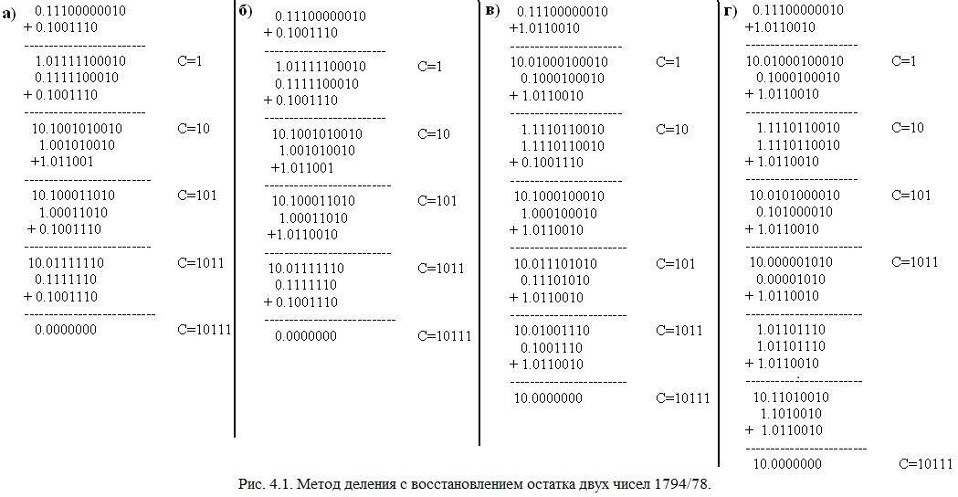 12). (из 18):    Укажите правильно реализованный метод деления с восстановлением остатка двух чисел 1794/78 (см. рис. 4.1):