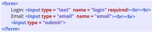 д) код HTML неверен, так как атрибут required не может применяться к полям формы;